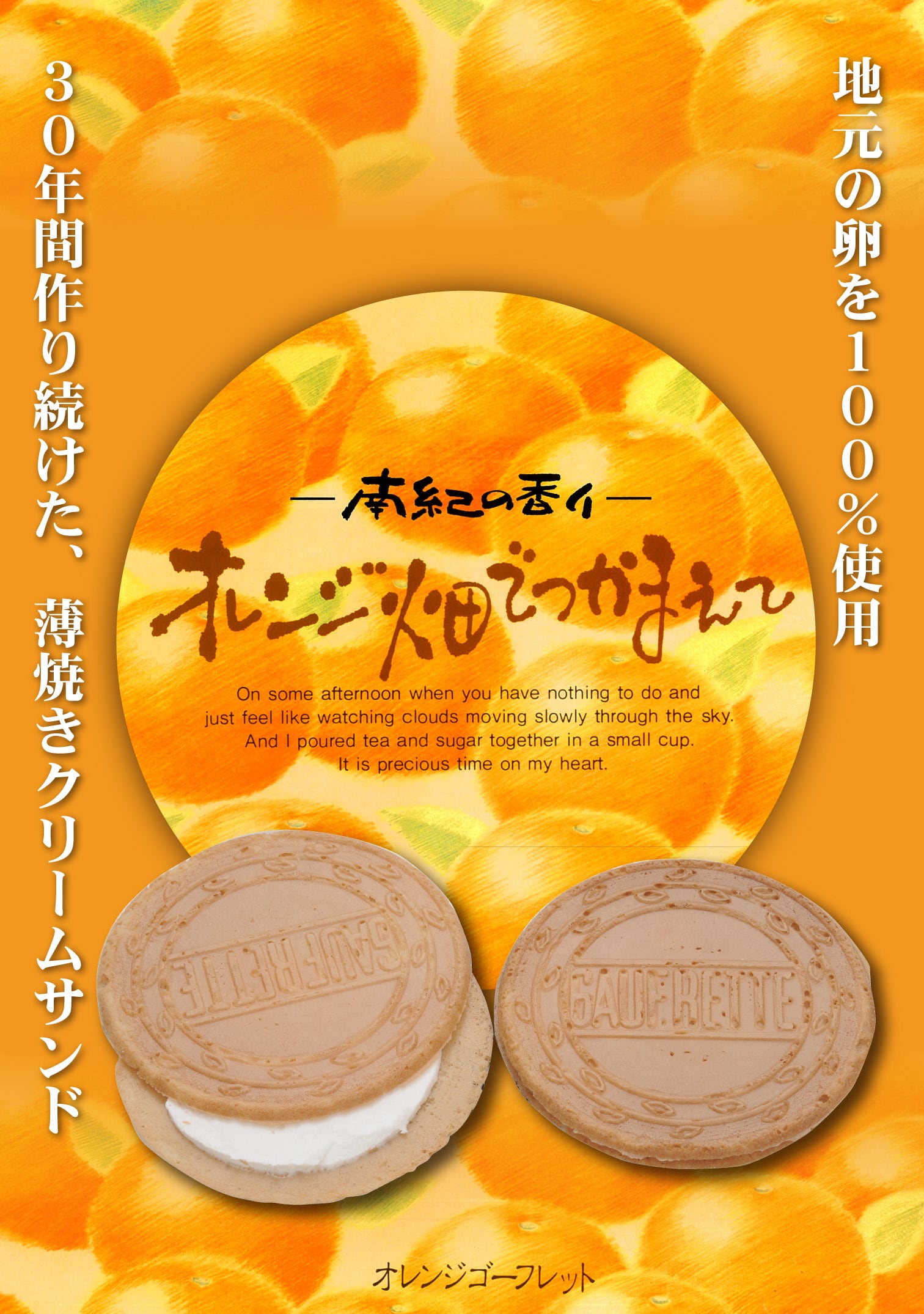 このお菓子を作り続けて、45年、薄いおせんべいに、蜜柑くりーむをサンドした、長年つい売り続け、進化しているお菓子です、限界まで薄く焼き上げた、おせんべいと、蜜柑の程よい酸味のクリームは絶妙です、