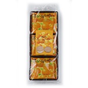 小麦粉(国内製造)、砂糖、加工油脂、植物油脂、卵、麦芽糖、脱脂粉乳、馬鈴薯粉、オレンジ果汁粉末、食塩、デキストリン/膨脹剤、香料、酸味料(クエン酸)、乳化剤、酸化防止剤(V.E)、カロチン色素、(一部に小麦・卵・乳成分・オレンジ・大豆を含む)