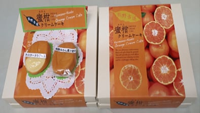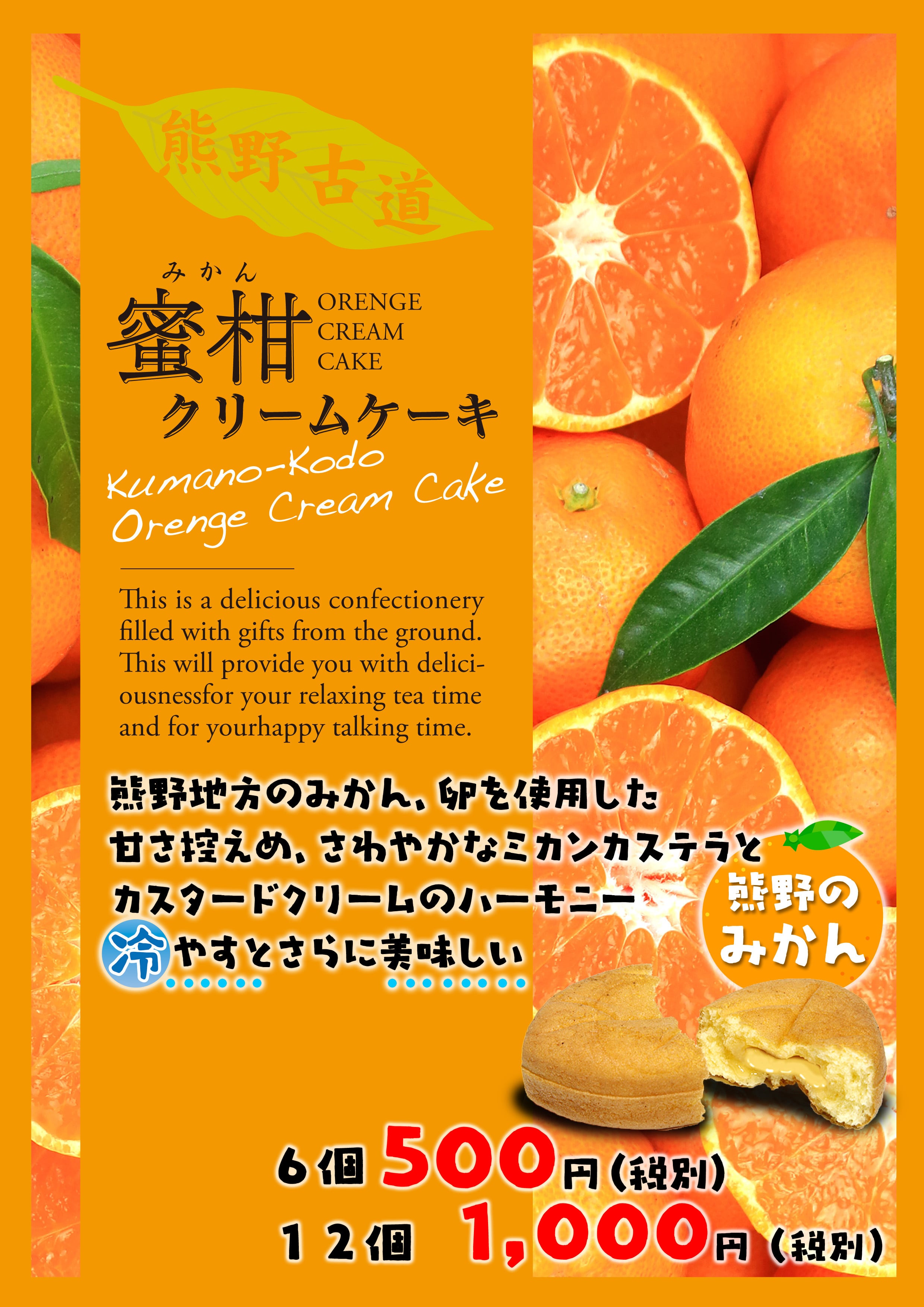 蜜柑の葉っぱをイメージした、形に焼きあげたお菓子です、生地には、地元の蜜柑果汁、工場近くの新鮮な卵を使用し、カスタードクリームを詰めて、しっとり、焼きあげました、はさみ焼の製法ですので、うまみを逃がさず、焼いています。